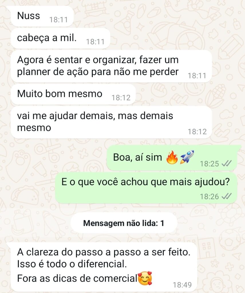 Suporte contínuo via WhatsApp, com respostas rápidas e orientação prática.